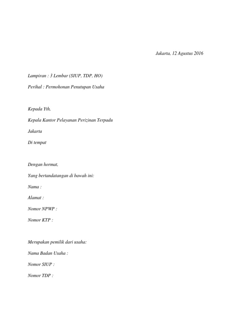 Biasanya memo dituliskan jika pengirim sedang tidak ada di tempat. Hal tersebut biasanya terjadi memang karena persaingan di dunia usaha sudah demikian ketatnya. Contoh surat permohonan penutupan perusahaan format ilustrasi surat ini saya ambil dari contoh surat yang sama yang diajukan oleh teman saya beberapa waktu yang lalu yang saat ini memiliki usaha yang telah resmi ditutup.